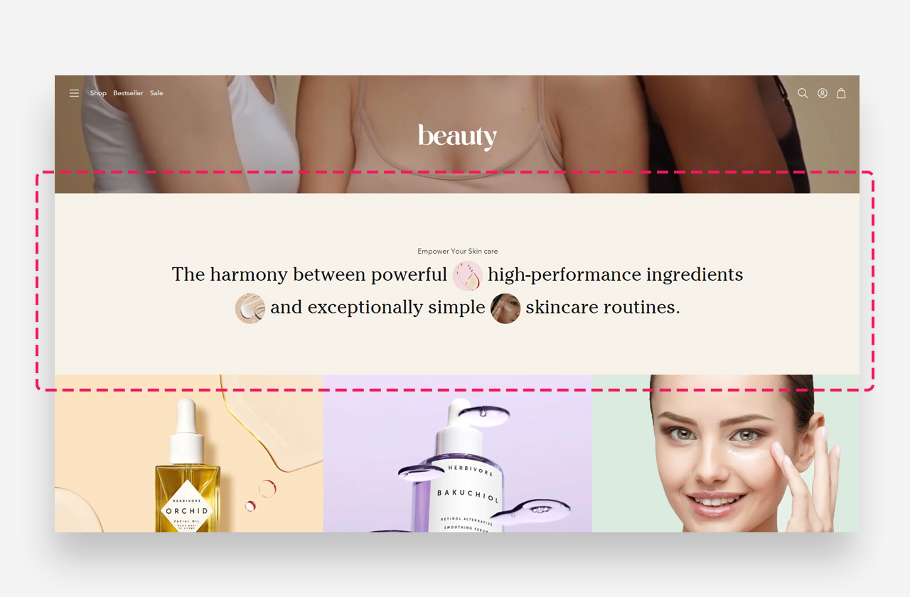 The "Rich text with image" section is an elegant and visually appealing element designed to enhance your store's storytelling. This section allows you to display text alongside up to three images in an aesthetically pleasing layout. Featuring hover animations and a seamless look, the images can be linked to products, collections, or other content, making it a versatile tool for driving engagement and guiding customers to key areas of your store.
