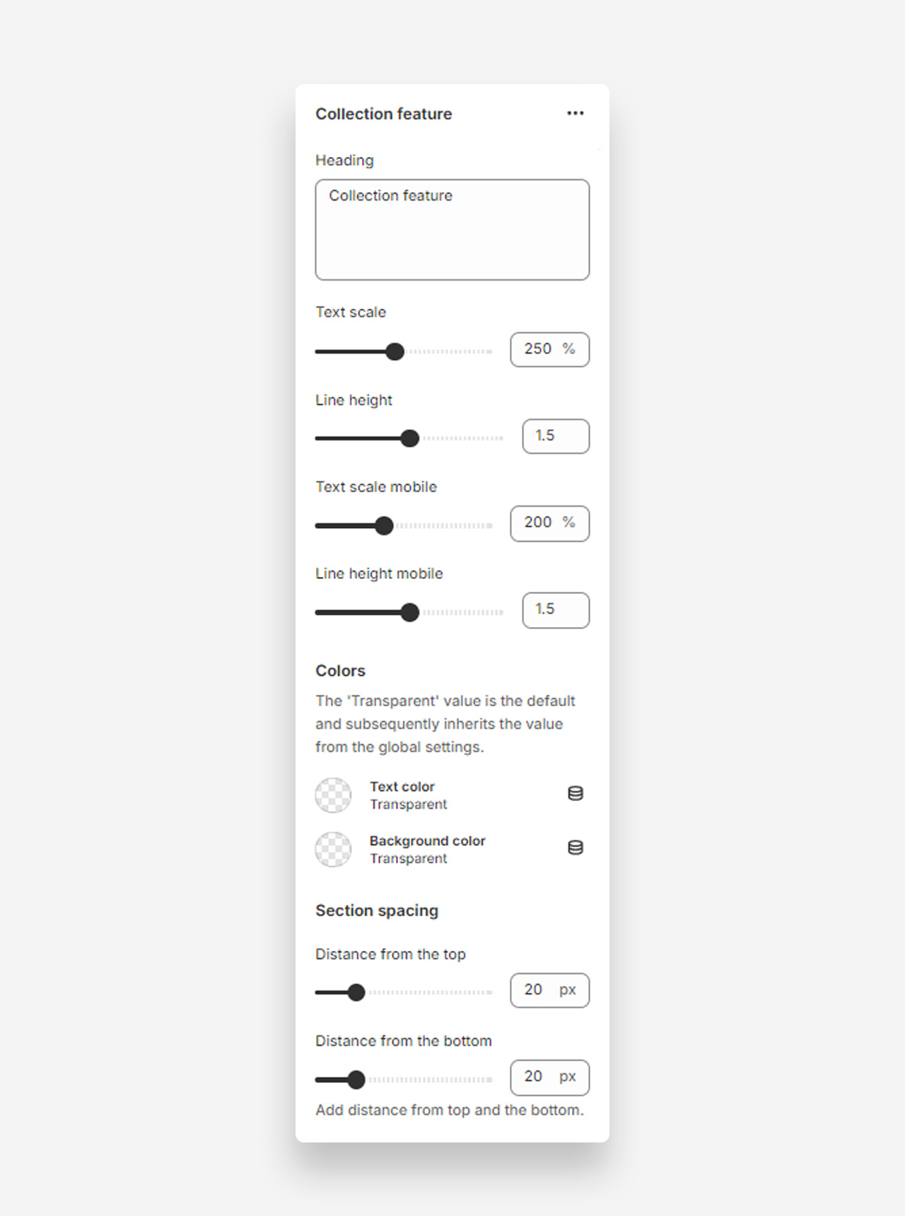 - Text color: The 'Transparent' value is the default and subsequently inherits the value from the global settings.