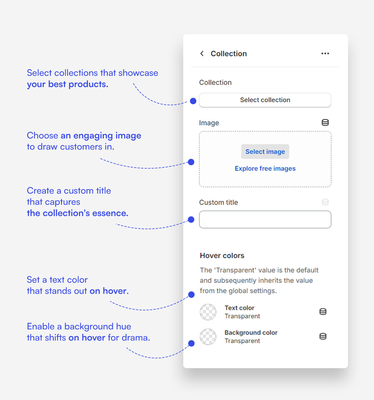 - Heading: Set the stage for your collections by entering a captivating title. This is the first impression that draws shoppers into the curated world of your featured products.