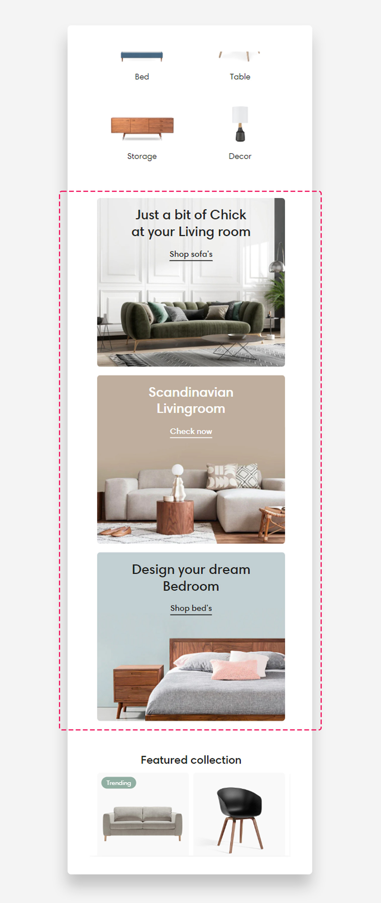 The "Collage" section is a creative layout that allows you to craft a visually engaging composition of images, text, and call-to-action buttons. This section is perfect for displaying a collection of products, brand images, or promotional graphics in a modern, asymmetrical format.