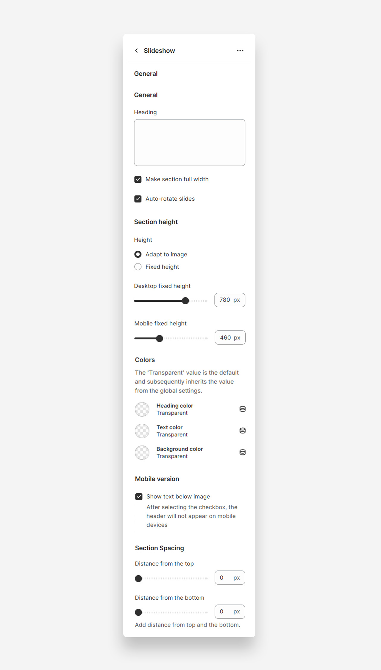 - Make section full width: Enable this setting to make the slideshow section span the entire width of the container.
