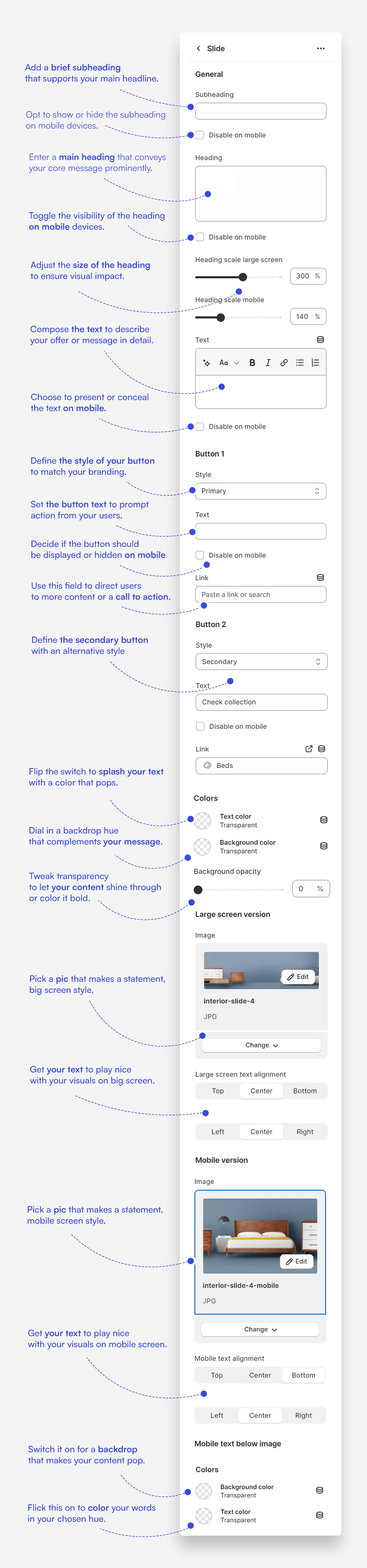 - Heading Scale: Adjust the size of the slide heading for both desktop and mobile screens to ensure its impact.