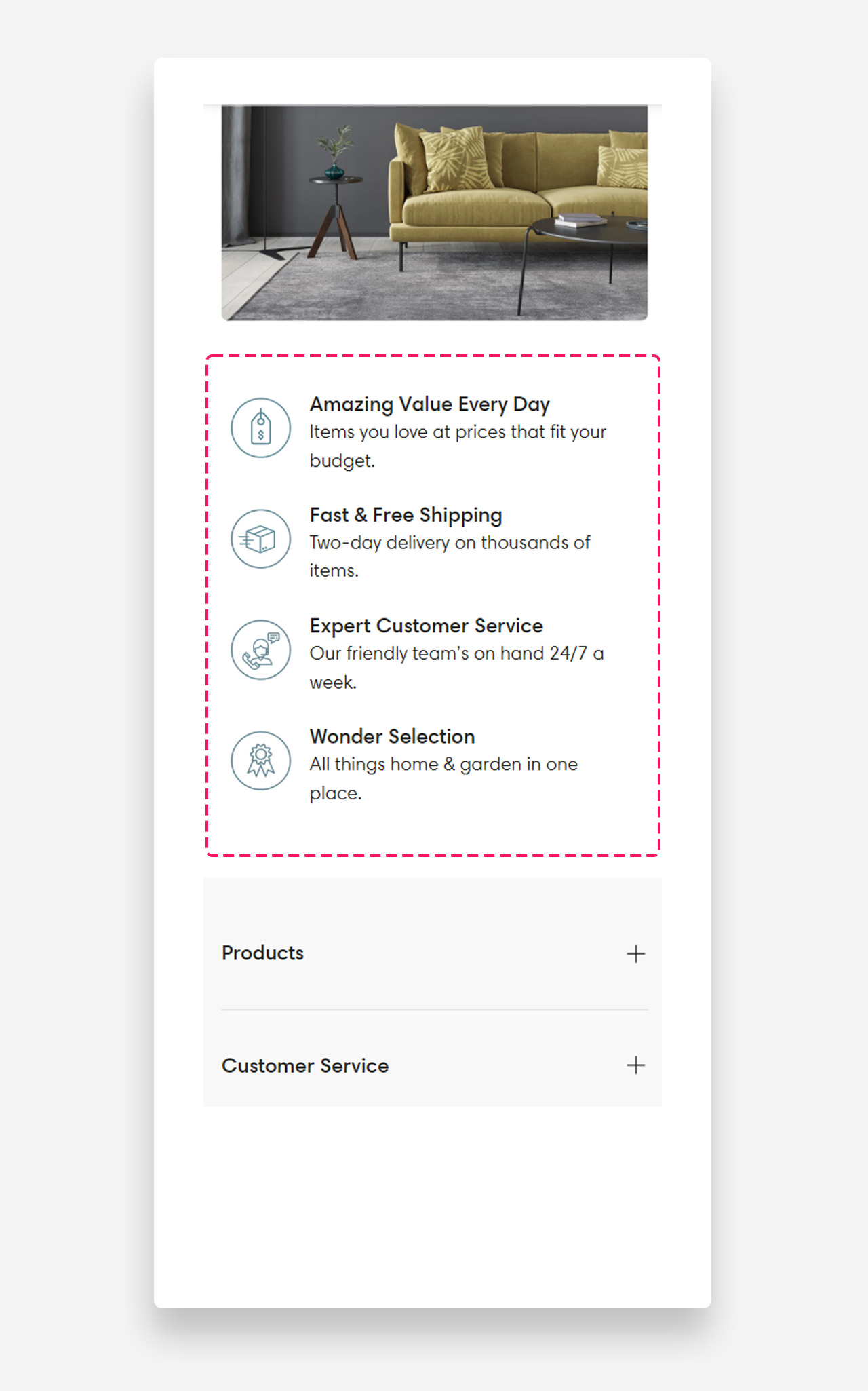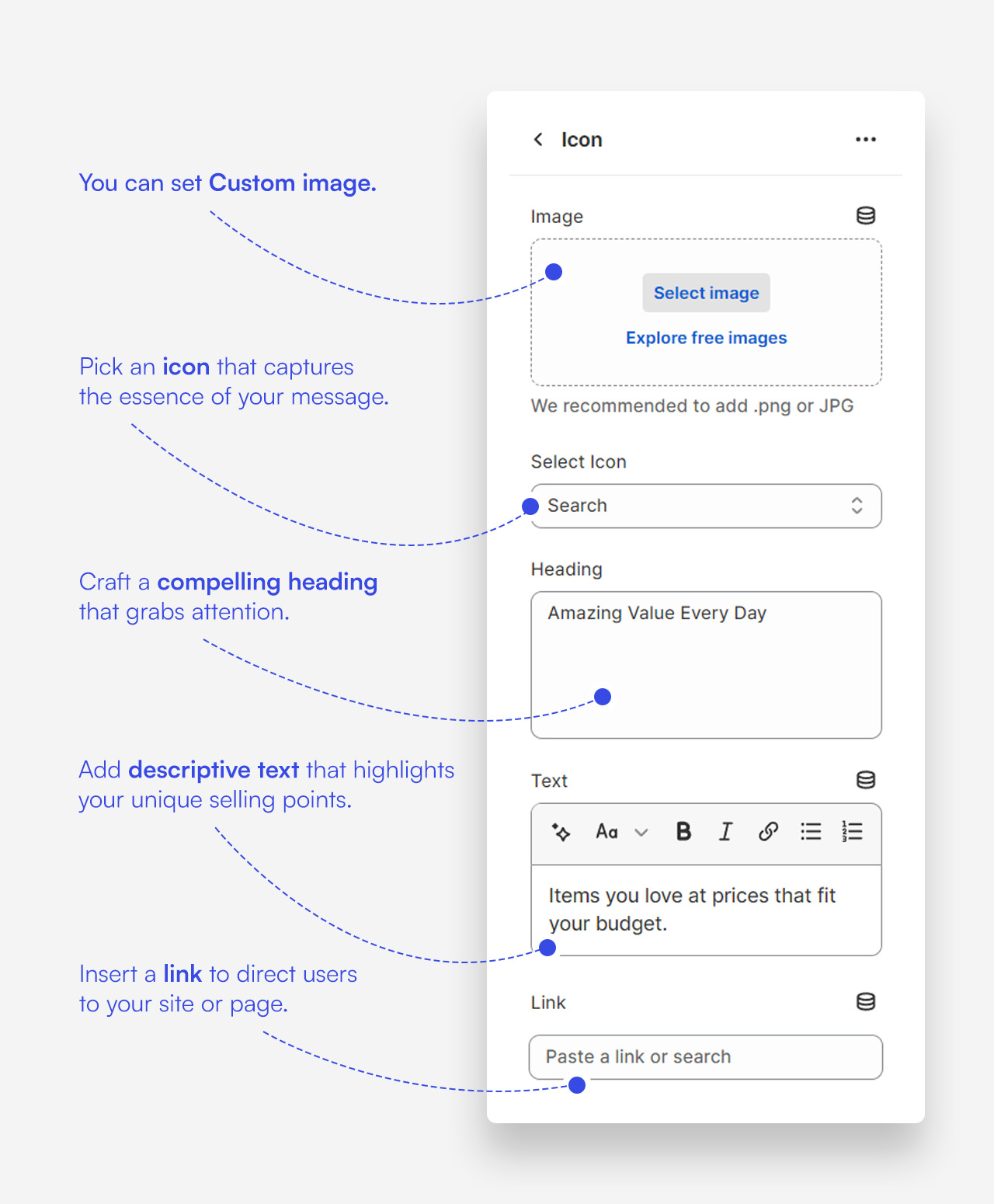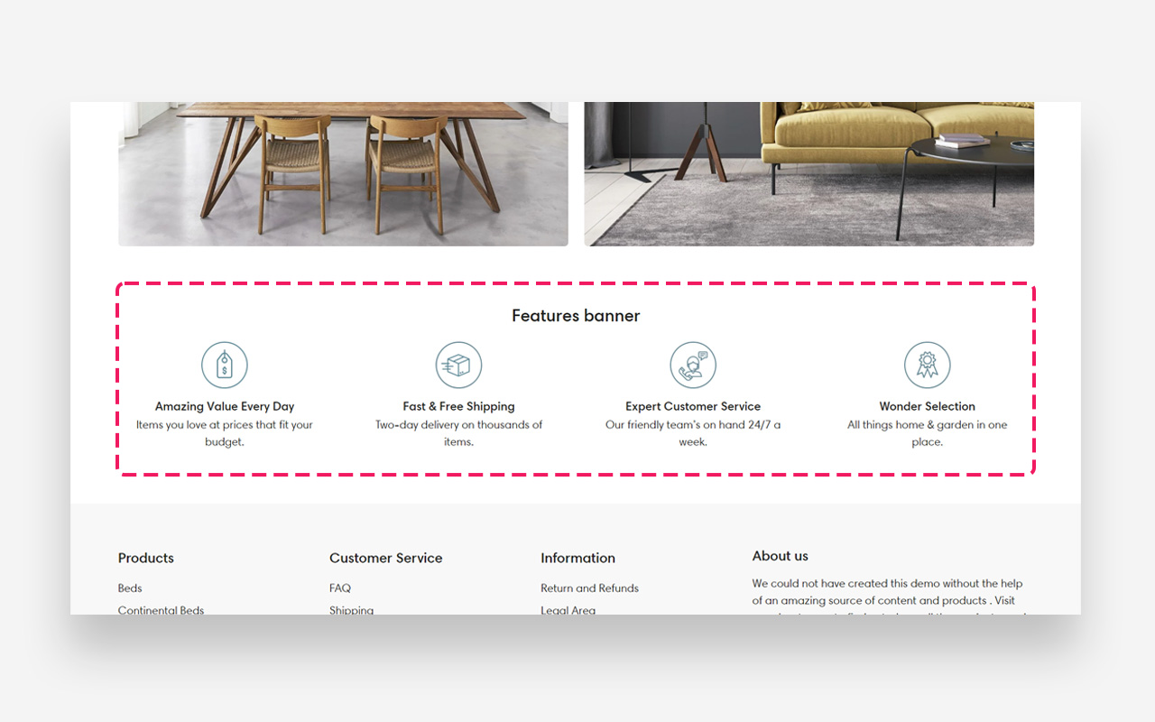 - Heading: Set the title for the features banner to highlight key aspects of your site or products.